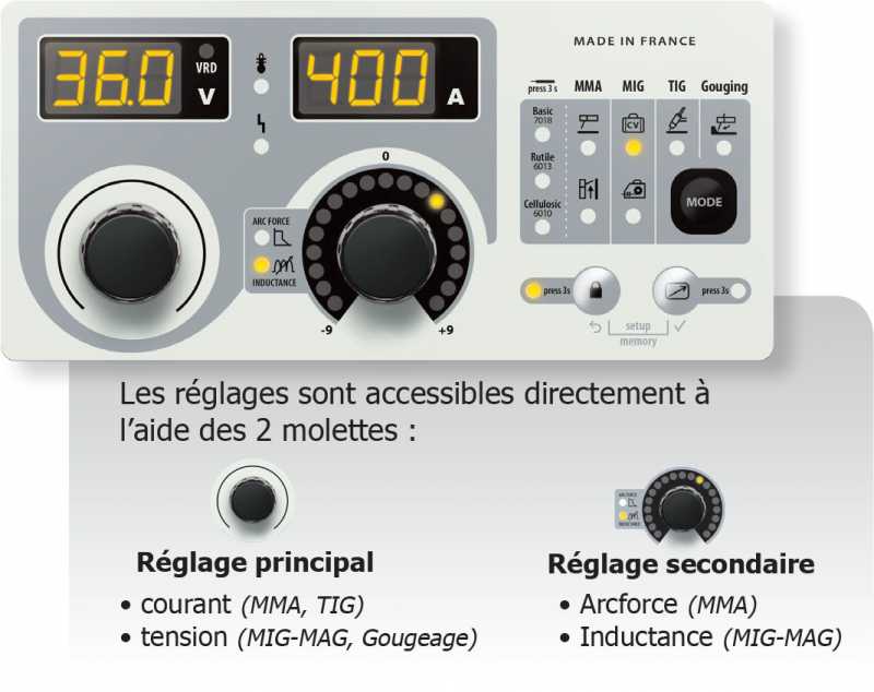 - MMA avec la possibilité de souder des électrodes jusqu'au Ø 6 mm